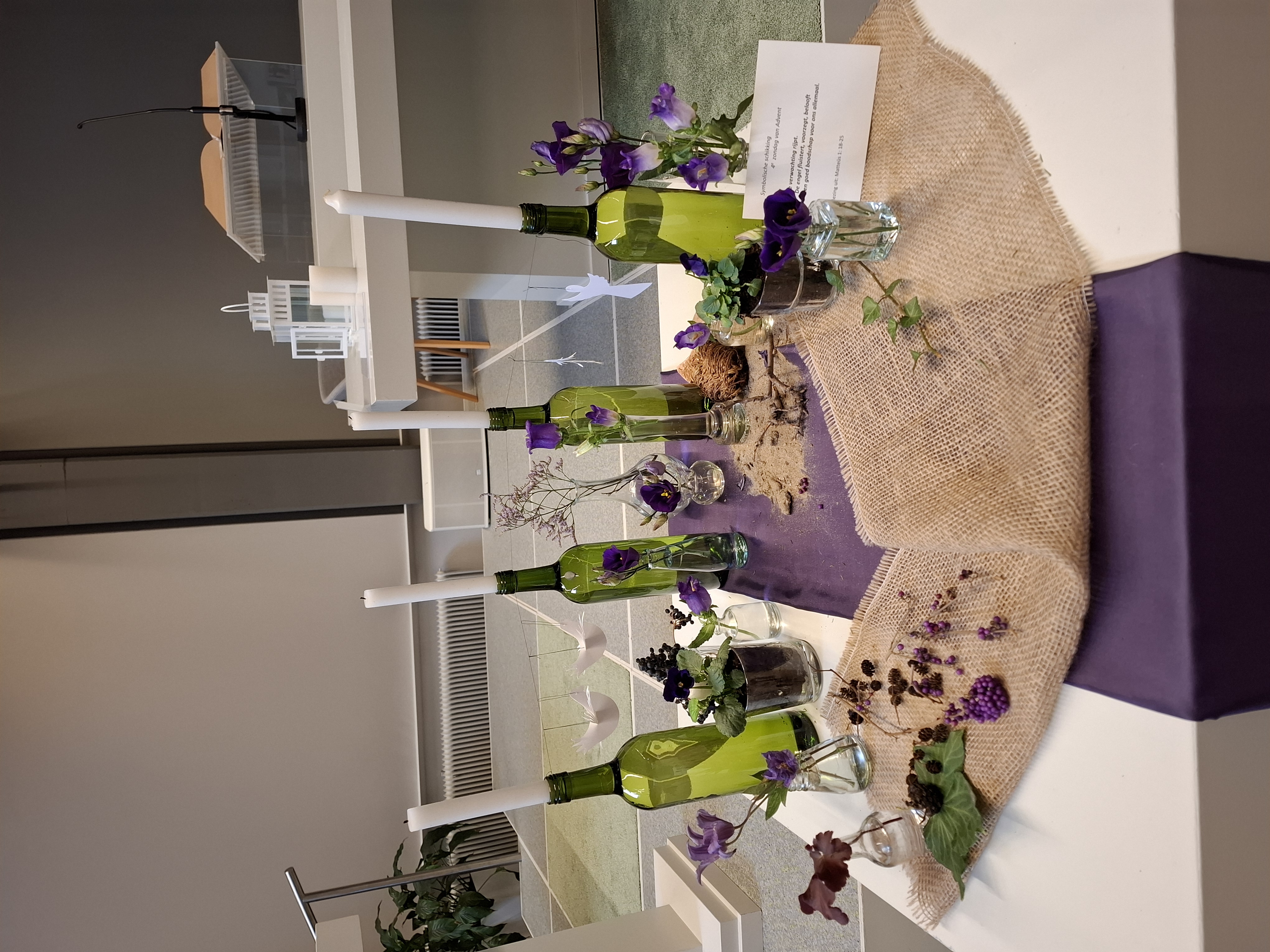 De schikking volgt het project van de kinderdienst de Geluksbezorger. Het is derde Advent; er branden nu drie kaarsen. Tussen de derde en vierde kaars hangt nu een takje, symbool van nieuw leven. In de aankleding zien we toefjes roze. Het donker wordt doorbroken.