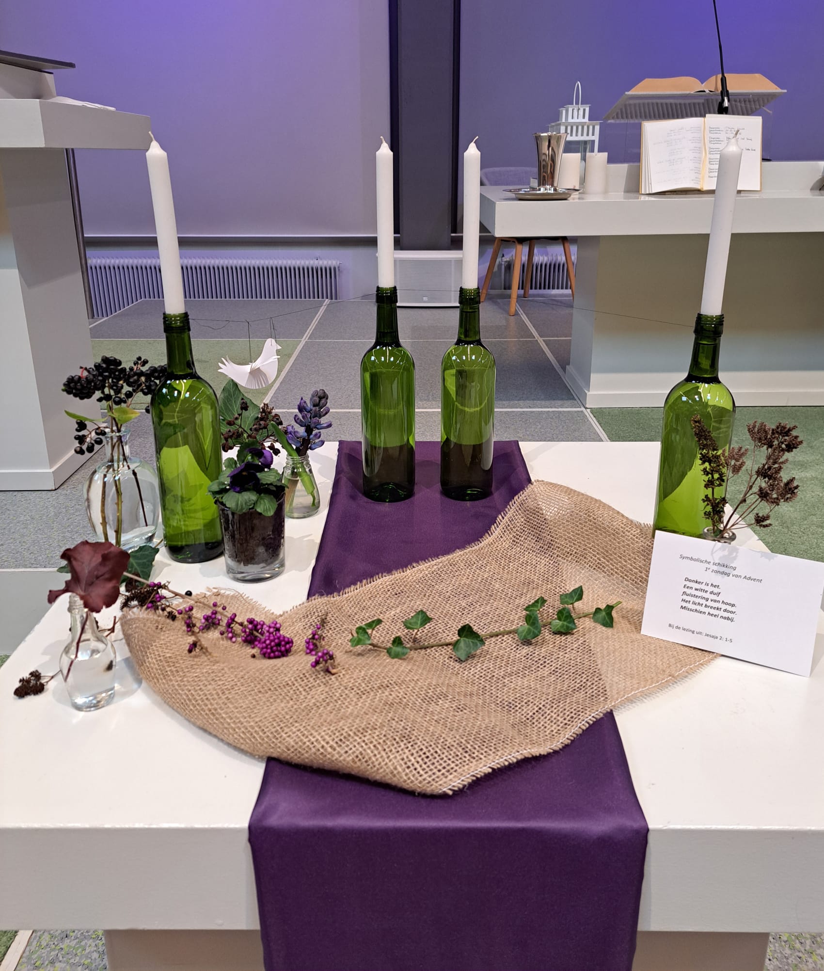 De eerste kaars is “aangekleed” met donkere en paarse materialen die het donker van het begin van de adventstijd benadrukken.